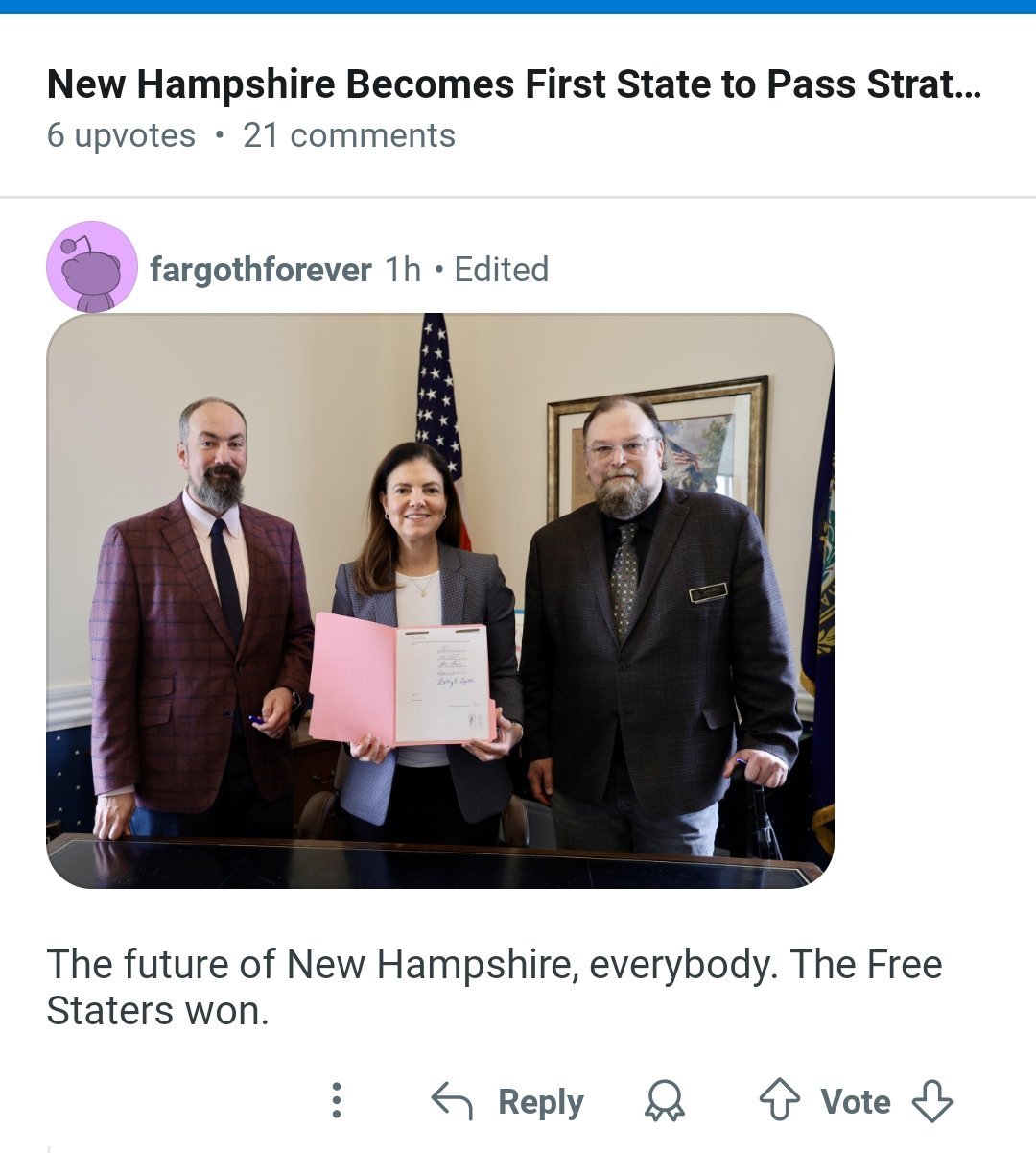 (6) Establishing a Strategic Bitcoin and Sound Money Reserve – making NH the first state authorized to hold treasury reserves in Bitcoin (and other qualifying cryptocurrencies), as well as gold and silver.