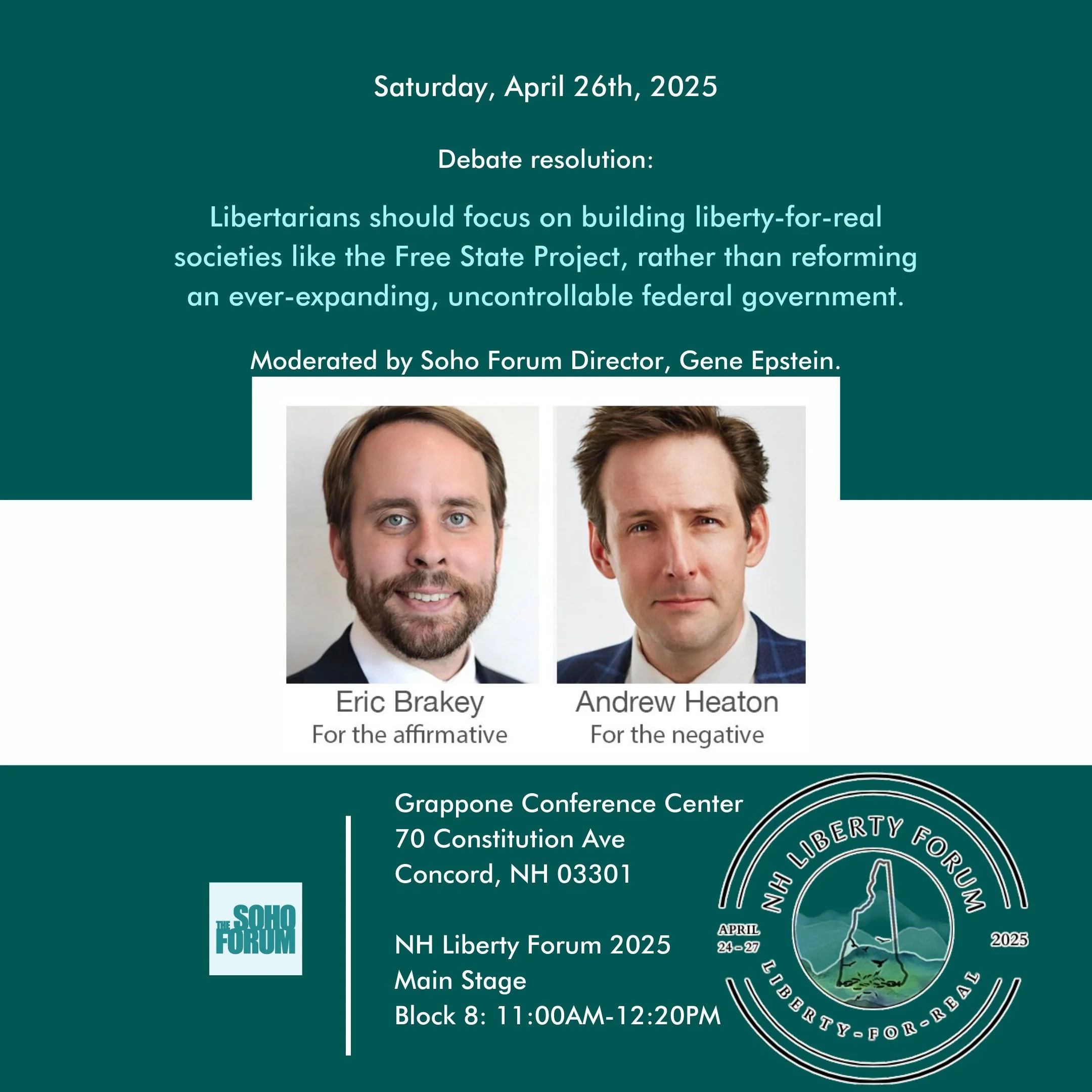 I am personally looking forward to the Soho Forum Debate on Saturday, moderated by Gene Epstein, between myself and Andrew Heaton on where libertarians should focus their efforts.