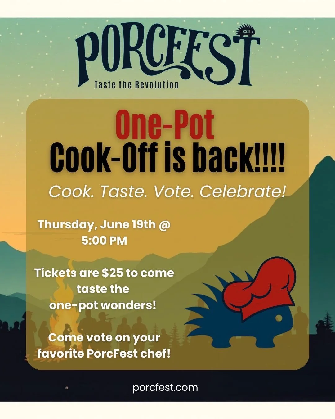 In keeping with our theme, we are restoring an old tradition: the “One Pot Cook-Off” is BACK at PorcFest!